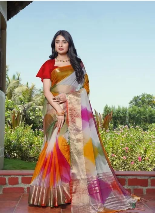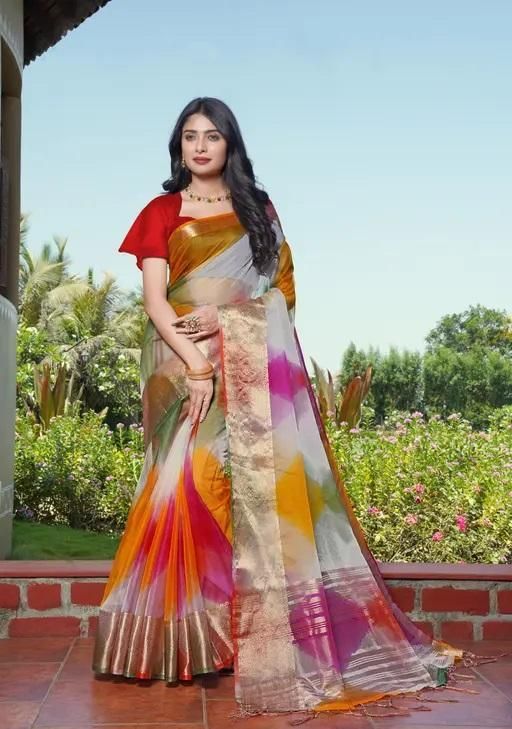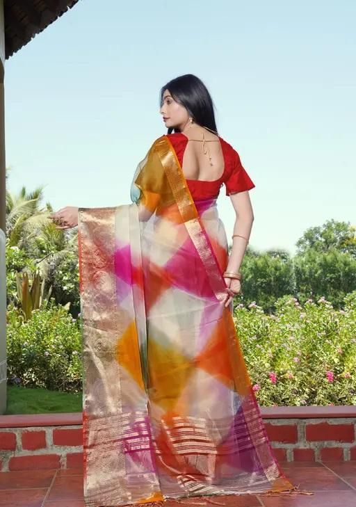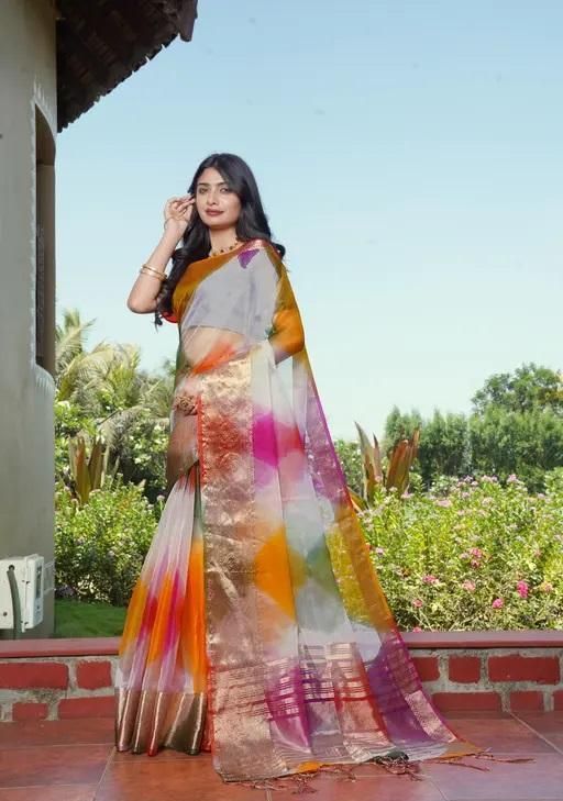 Name: "Premium Organza Multicolor Saree with Rich Zari Work | Soft Fabric | Stylish Saree for Women"