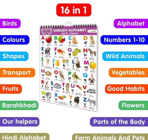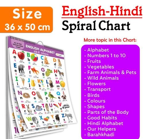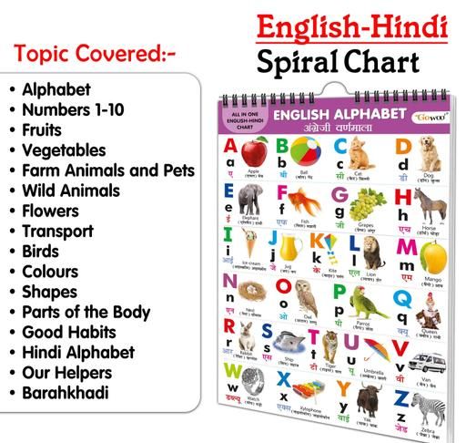ENGLISH-HINDI Chart For Kids (16 Charts ) 36 x 50 cm - Children Spiral Wall Picture Chart