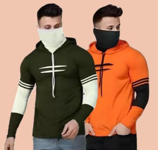 Name: Cotton Blend Men's T-shirts with Full Sleeves & Hooded Neck with Inbuit Mask Combo (Pack of 2)