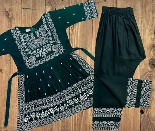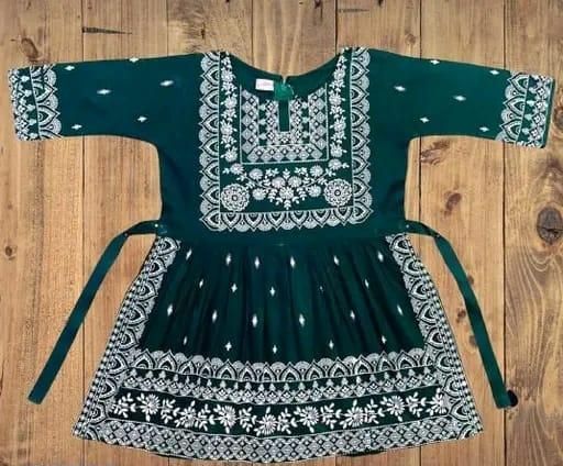 Name: baby girl dress | dark green with white embroidery, A-line kurta, flared hemline, embroidery, A-line, ethnic/festive, kurta set, tie waist, pull-on, three-quarter, V-neck, regular, tiered, above knee, Girls, festive, all-season