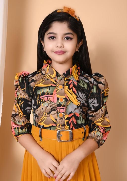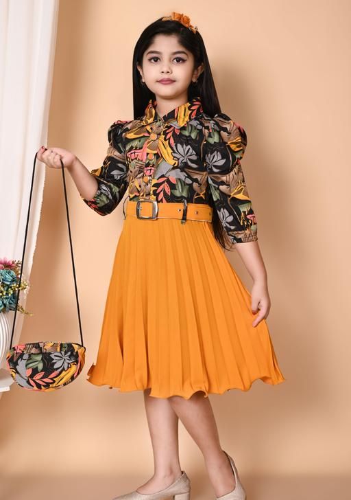 Stylish Girls Printed Frock and Dress Pleated kids Dress with Matching Bag and Belt Perfect Kids Frock for Special Occasions Birthdays gril frock and Parties 10 years gril dress Trending frock High Demand Fashion Frocks and Dresses for Cute 8 years Girl dress | mustard yellow and black/grey/brown floral print, Two-piece style dress with a printed top and solid pleated skirt., A-line, one-piece, pleated dress, pleated skirt, belt, puff sleeves, buttons, puff sleeve, polo/collar, belted,