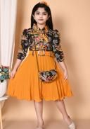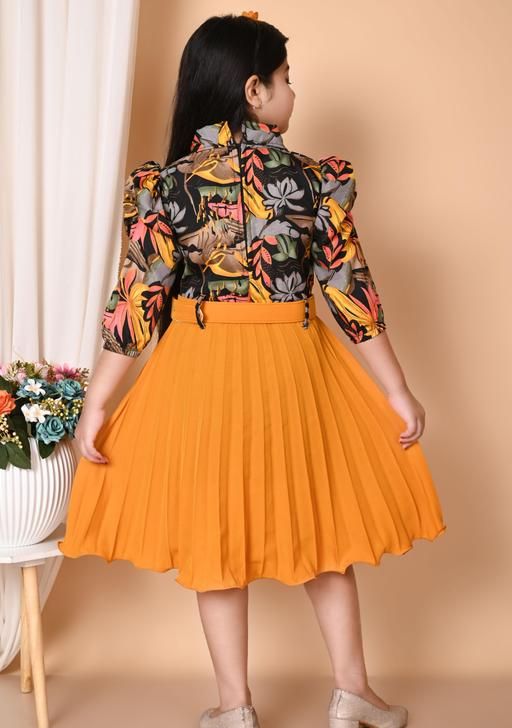 Name: Stylish Girls Printed Frock and Dress Pleated kids Dress with Matching Bag and Belt Perfect Kids Frock for Special Occasions Birthdays gril frock and Parties 10 years gril dress Trending frock High Demand Fashion Frocks and Dresses for Cute 8 years Girl dress | mustard yellow and black/grey/brown floral print, Two-piece style dress with a printed top and solid pleated skirt., A-line, one-piece, pleated dress, pleated skirt, belt, puff sleeves, buttons, puff sleeve, polo/collar, belted,