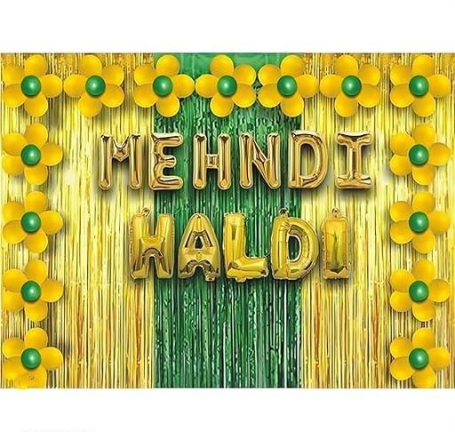 Haldi And Mehandi Ceremony Decoration Pack of 44 items | Decoration Kit contains 1 Haldi and 1 Mehandi Foil Balloon, 30 Green and Yellow Balloons And 2 Golden and 1 Green Fringe Curtains