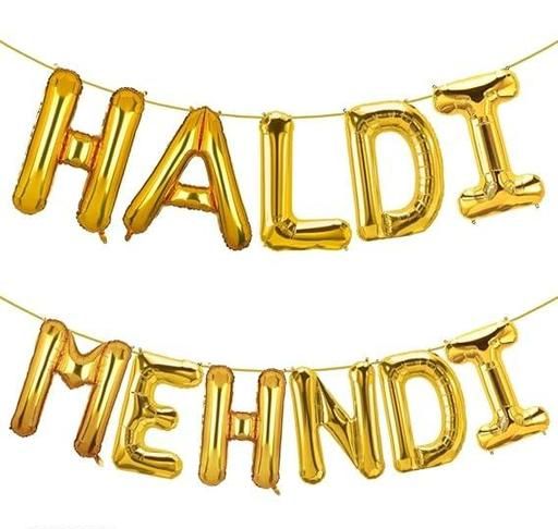 This comprehensive kit features 1 Haldi and 1 Mehandi foil balloon in elegant golden hues, symbolizing prosperity and cultural significance.