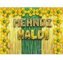 Name: Haldi And Mehandi Ceremony Decoration Pack of 44 items | Decoration Kit contains 1 Haldi and 1 Mehandi Foil Balloon, 30 Green and Yellow Balloons And 2 Golden and 1 Green Fringe Curtains