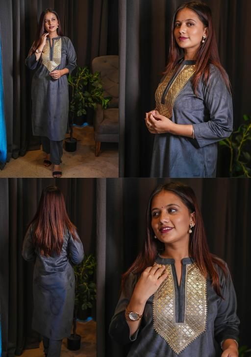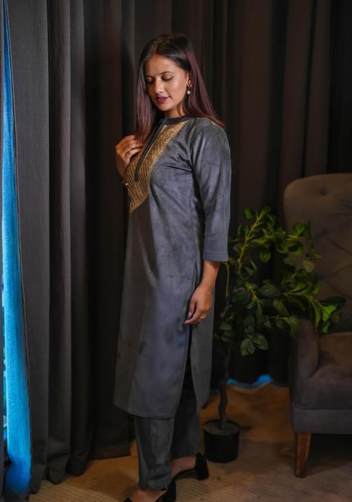Name: Women's Woolen Velvet Kurta and Pant Set | Winter Wear | Warm Velvet Ethnic Outfit | V-Neck Embroidery Lace Work Design | Grey Color