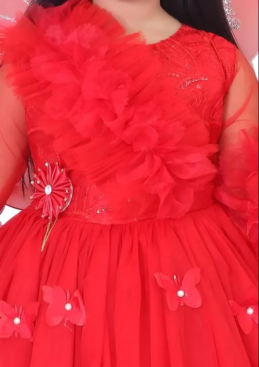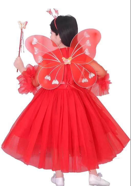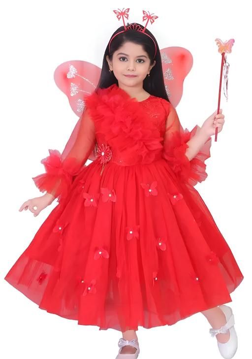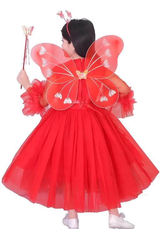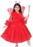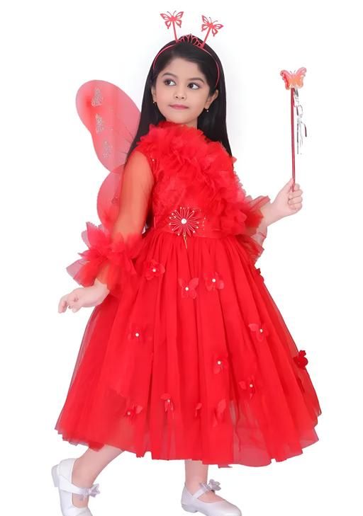 Girls Angel Pari frock Dress, Pori frock dresses for girls. | red solid, A-line silhouette, layered tulle skirt, sequins, appliqués, 3D butterfly embellishments, A-line, one-piece, butterfly dress, ruffles, tiered skirt, long sleeve, round, tiered, midi, Girls, partywear, tulle, all-season, headband, wings, wand