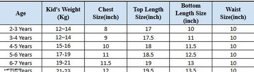 2-3 Years (Top Chest Size: 13 null, Top Length Size: 17 null, Bottom Waist Size: 13.5 null, Bottom Length Size: 18.5 null)