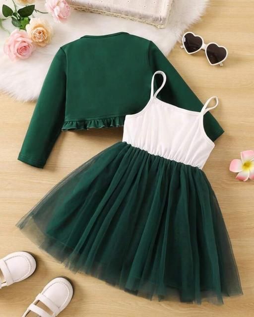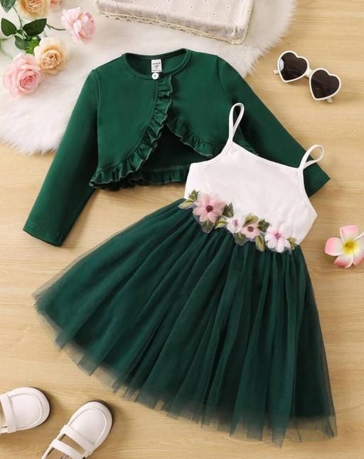 Baby Girl Ruffle Trim Jacket & Appliques Mesh Flare Hem Cami Dress.