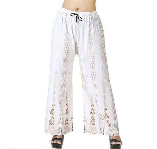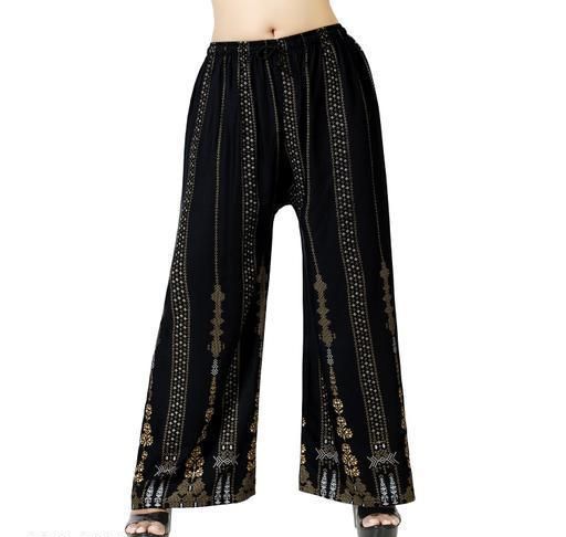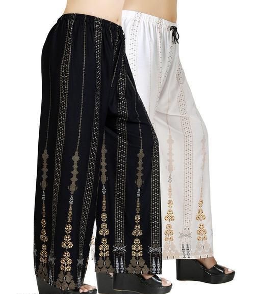 A pack of 2 bottom wear women's palazzo pants in black and white typically includes two pairs of palazzo pants, one in black and one in white. Palazzo pants are a type of wide-legged trousers that are loose-fitting and flowy, providing comfort and freedom of movement. They are often made from lightweight fabrics such as cotton, silk, or rayon, which makes them perfect for warm weather or casual occasions.