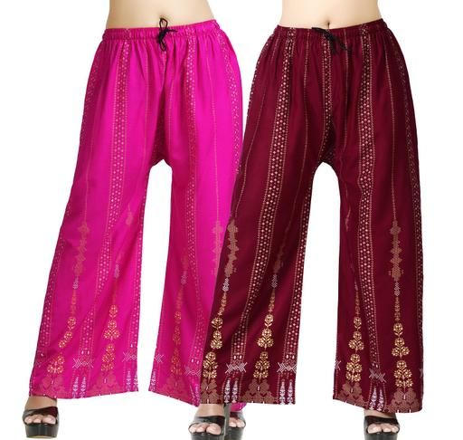 A pack of 2 bottom wear women's palazzo pants in rani and maroon typically includes two pairs of palazzo pants, one in rani and one in maroon. Palazzo pants are wide-legged trousers that are flowy and comfortable, making them perfect for a variety of occasions.