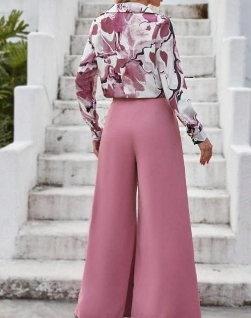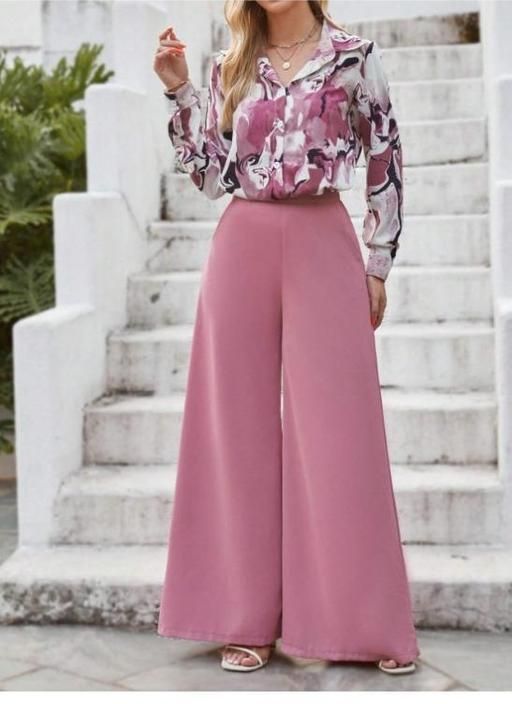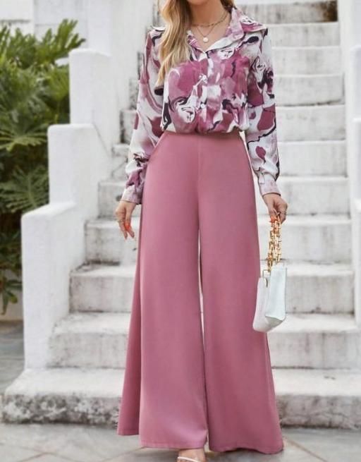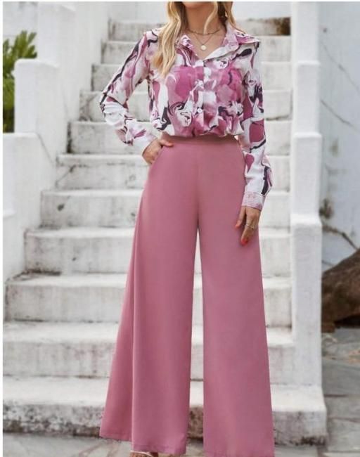 Name: Trendy Latest Women top and bottom set, Women's Printed Shirt and Solid Wide Leg Trousers Co-ord Set, Poly-Crepe Printed Shirt with Plain Pink Trousers Combo, New Collection Printed Co-ord Set, Attractive Daily Wear Co-ord Set..