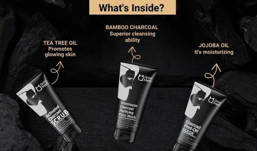 Remove impurities and dirt effectively with our Himalayan charcoal purifying face wash, formulated with bamboo charcoal from the Himalayan foothills. Enriched with community trade tea tree oil and eucalyptus oil known for their purifying properties, this wash leaves skin feeling clean and reduces excess oils. Detoxifying charcoal scrub delivers a deep-pore clean. Natural charcoal draws out the dirt and excess oil that can clog pores. Soothing, non-drying lather gently washes away impurities. This face scrub is the weapon for dead cells and hard skin. Provides deeply cleaned, tingly-smooth skin. Polish your skin with the best charcoal scrub. Qraa Men charcoal peel-off mask is with super volcanic cluster that powerfully adsorbs sebum to intensively resolve pore concerns. As the capsule bursts, the mask exfoliates and removes dead skin cells. The aha ingredient chemically exfoliates and smoothens out skin. The strong absorption of sebum and cooling effect of the charcoal refreshes the skin and counteracts pores.