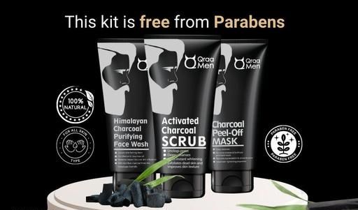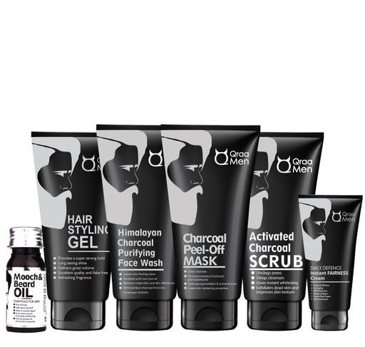 Qraa Men Charcoal Kit-Scrub,Face wash,Peel-off Mask,Hair Styling Gel,Daily Defence Fairness Cream,Mooch Oil | Pack of 6 (6 Items in the set)