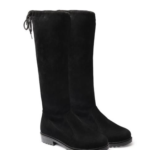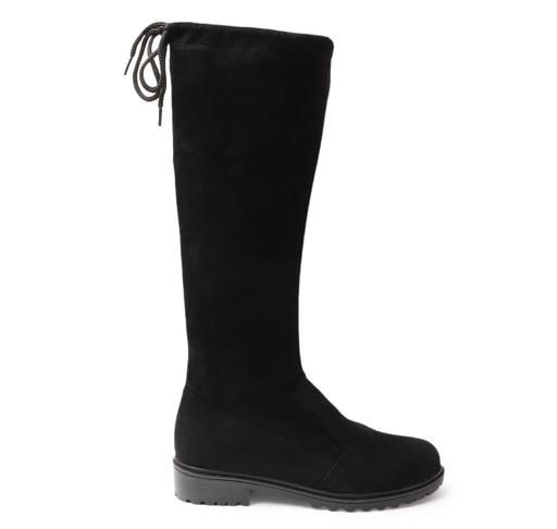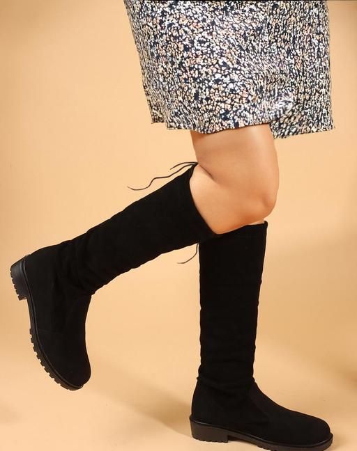 Name: Below the Knee Boots Black Material: Suede Sole Material: Airmix Pattern: Solid Net Quantity (N): 1 Sizes: IND-3, IND-4, IND-5, IND-6, IND-7, IND-8 This boot Below the knee boot and back upper side lace for calf-length fitting Country of Origin: India