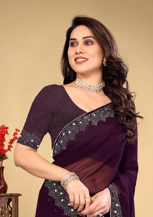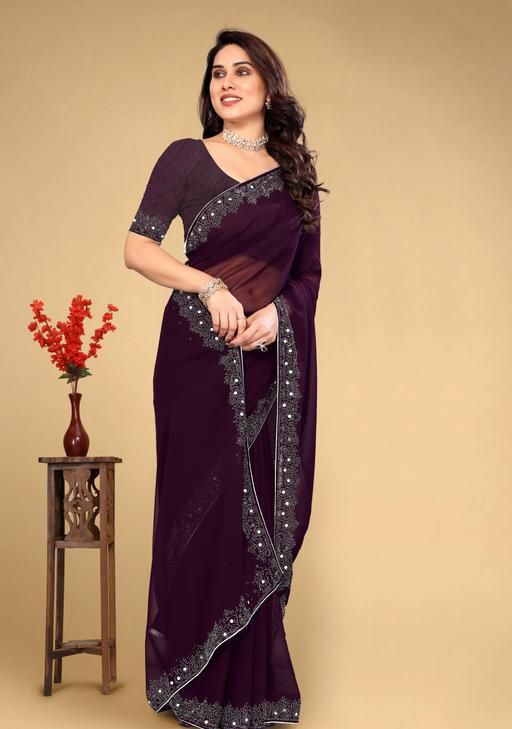 Famous designers tend to give reign to their imagination and create clothes that look interesting and guided by the desire to attract attention. You are bound to make a impressive style statement with this wine pure satin chiffon. Beautified with all synchronized effectively through the pattern and design of the saree. Comes with matching blouse.