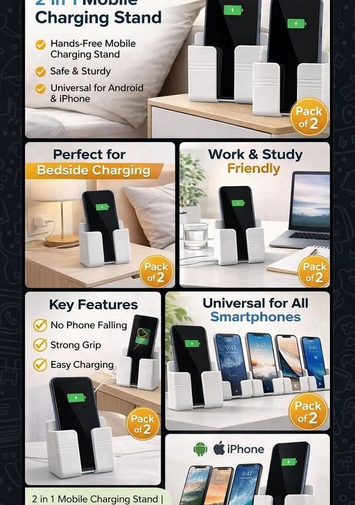 This Wall Mounted Mobile Charging Holder (Pack of 2) helps you charge your phone easily without leaving it on the floor. Made with durable, high-quality plastic, it can hold most smartphones safely. Equipped with strong adhesive tape, it mounts to the wall instantly—no drilling needed!