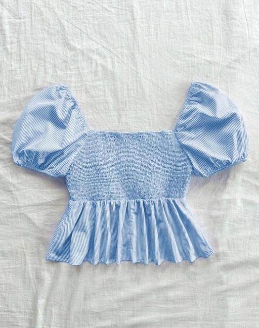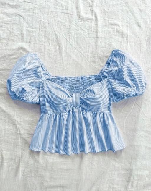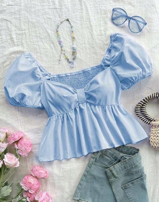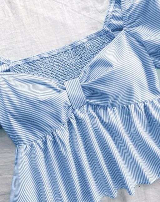 Name: Cotton Stripe Puff Sleeve Shirt With Bow Tie, Peter Pan Crop Top Blue