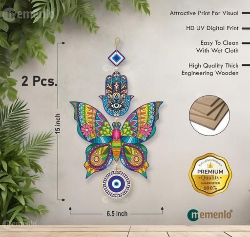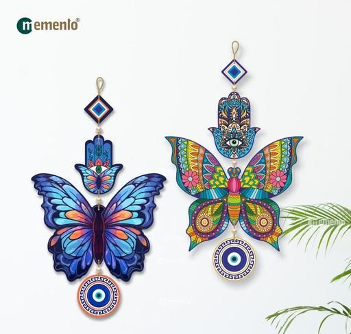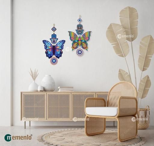 Ideal for both the living room and bedroom, these wall hangings bring a touch of modern elegance with a dash of cultural significance. The vivid colours and intricate butterfly design create a lively and welcoming atmosphere, while the Evil Eye element offers a sense of protection and positivity.