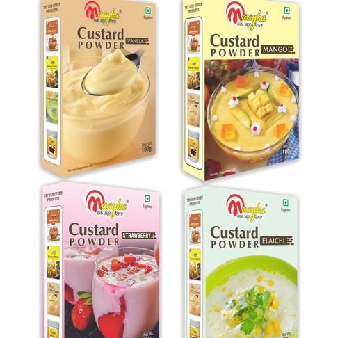 Name: Maayka Premium | Combo of Custard Powder 100g x 4 Flavors (Vanilla, Strawberry, Mango, White Elaichi) - Total Weight 400 Gram