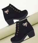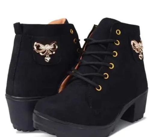 Step into style with these fashionable black ankle boots, featuring a sleek lace-up design and an elegant bow embellishment. Made from premium faux suede, these boots are perfect for casual outings, parties, or even winter adventures. The sturdy sole ensures long-lasting comfort, while the chic design adds a bold statement to any outfit. Pair them with jeans, skirts, or dresses to create a versatile and trendy look. Add these must-have boots to your collection and enjoy the perfect combination of style and comfort.Premium faux suede material.Trendy lace-up design with embellishments.Durable and comfortable sole.Versatile styling for casual or partywear.Available in multiple sizes.Black boots for women, stylish women boots, ankle boots, lace-up boots, winter boots, trendy women footwear, affordable women boots.