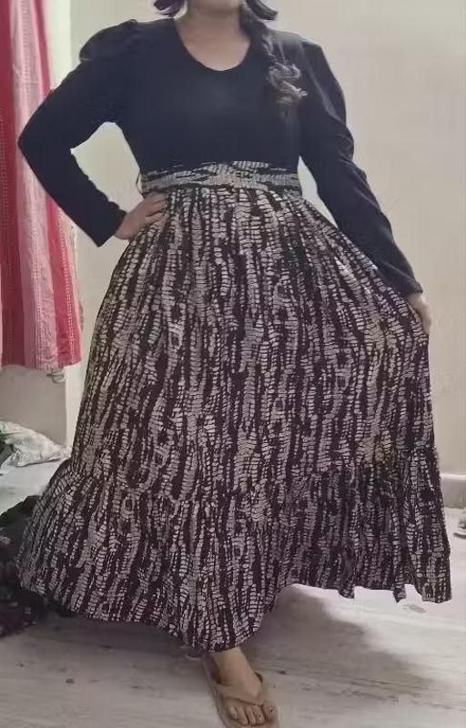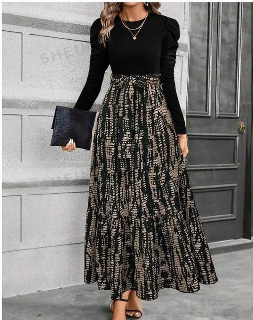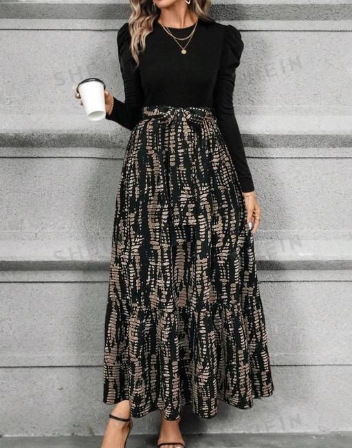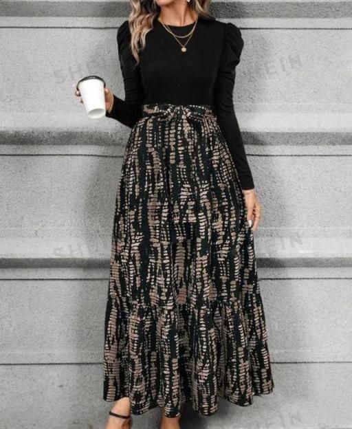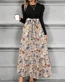 Name: Clasi Women's Autumn Dress With Bow Tie Belt, Leaf & Floral Patchwork A-Line Skirt Maxi Women Outfit