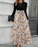 Clasi Women's Autumn Dress With Bow Tie Belt, Leaf & Floral Patchwork A-Line Skirt Maxi Women Outfit