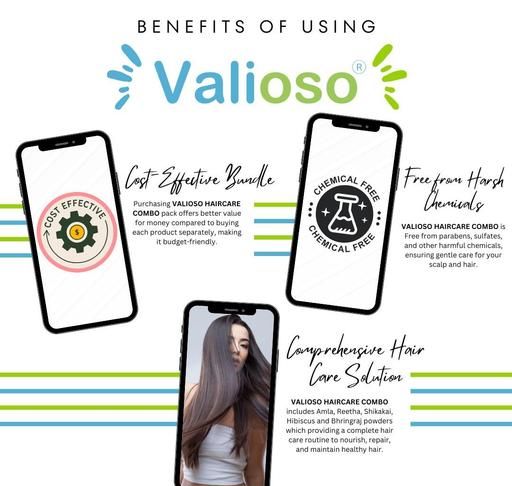 Valioso Amla, Reetha, Shikakai Powder for Hair Care is a powerful and comprehensive solution for achieving healthy, strong, and beautiful hair. With its natural ingredients and versatile usage options, it provides an all-in-one solution for your hair care needs. Incorporate it into your routine to enjoy the benefits of Amla, Reetha, and Shikakai for your hair. Valioso Hibiscus Powder brings a positive Change in Hair Growth, also it is rich in amino acids, that nourish the Hair, Strengthen the Roots, and keep your locks Lustrous And Healthy. Regular application of the Bhringraj powder helps in increasing hair volume and Quality and bestowing the user with thicker, stronger and lustrous hair. The powder has anti-microbial, anti-inflammatory, detoxifying and anti-oxidant properties. Hence it is effective against minor skin allergies, skin aging and other skin issues. HOW TO USE FOR HAIR APPLICATION: All you need to do is, mix Valioso Bhringraj Powder with an equal amount of Valioso Amla Powder, and Valioso Shikakai Powder, in some water to make a paste that's fluid in consistency. Apply it on wet hair, keep it for two or three minutes, and wash it off with water. For best results, use it as herbal shampoo regularly. Valioso Bhringraj powder is free from any preservative or pesticides.