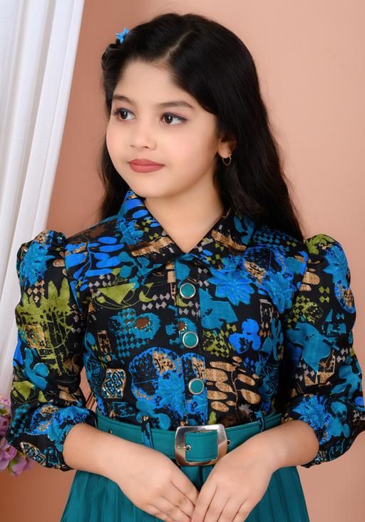 Name: New stylish floral Baby Girls Dress/Frocks , with same design Bag and Belt Perfect Kids Frock | teal and black abstract print, A-line silhouette, pleated skirt, belted waist, A-line, one-piece, pleated dress, pleated skirt, belt, buttons, puff sleeve, polo/collar, belted, curved, above knee, Girls, partywear, all-season, belt, purse