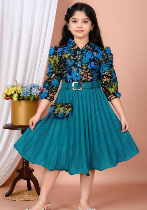 New stylish floral Baby Girls Dress/Frocks , with same design Bag and Belt Perfect Kids Frock | teal and black abstract print, A-line silhouette, pleated skirt, belted waist, A-line, one-piece, pleated dress, pleated skirt, belt, buttons, puff sleeve, polo/collar, belted, curved, above knee, Girls, partywear, all-season, belt, purse