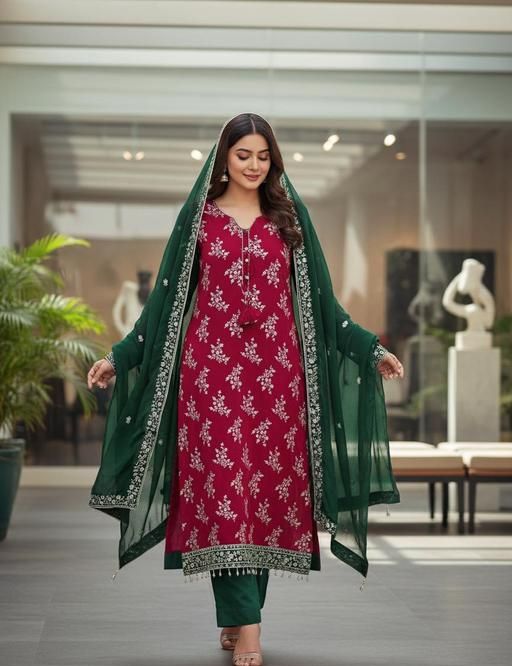 Is dress material ka graceful ethnic print festive functions, family gatherings, party wear aur classy daily wear ke liye ideal hai. Fabric ka texture airy hone ki wajah se suit bulky feel nahi karta, jisse stitching ke baad finishing aur look aur bhi premium lagta hai.