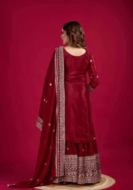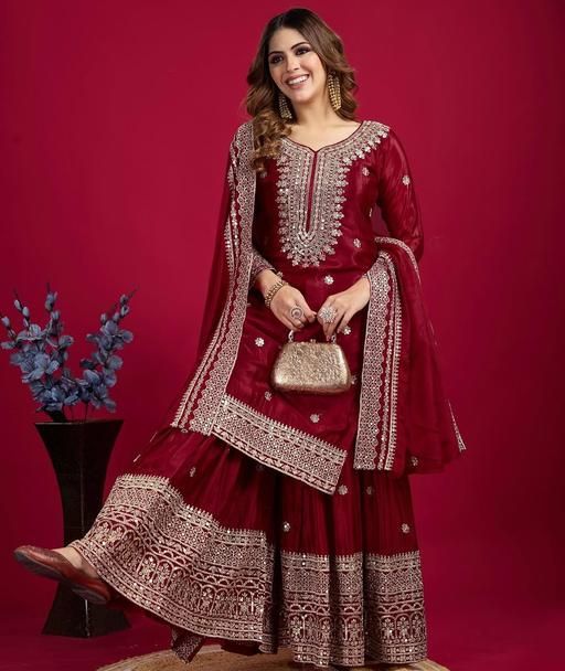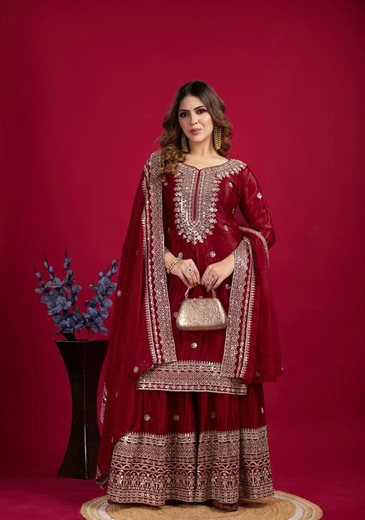 Presenting New Chinnon Silk With Heavy Embroidery Work Top-Plazo And Dupatta Set With Fully Stitched Ready To Wear Collection