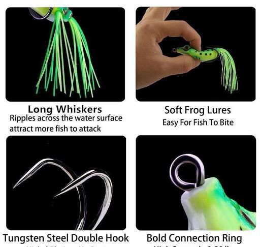 3 D Stereoscopic Eyes: Our fishing frog has 3D stereoscopic eyes, which make the fish look more vivid and lifelike so as to attract the target fish. Sharp Nickle Treble Hook: The hooks of our topwater bass lures are incredibly strong, and can easily pierce the fish, and the sharp nickel hook makes it hard for fish to escape Soft Frog Body. The bass lures consist of a super-soft hollow body that creates lifelike swimming actions in water. Soft bodies help drain water quickly for better hook-up ratios. Perfect 45° Angle Sitting: The center of gravity for frog baits is constantly checked to ensure the best angle for sitting inside the water, which helps with hookup success. Perfect Coated Weight: Boasts a special-shaped weight with a finish coating for zero hook interference during the strike and to help anglers attract a bigger catch. Life-like Action: High-resolution body detail and almost real swimming actions replicate an actual frog flawlessly. If you want to get some frogs to try out this season, these are your lures!