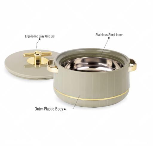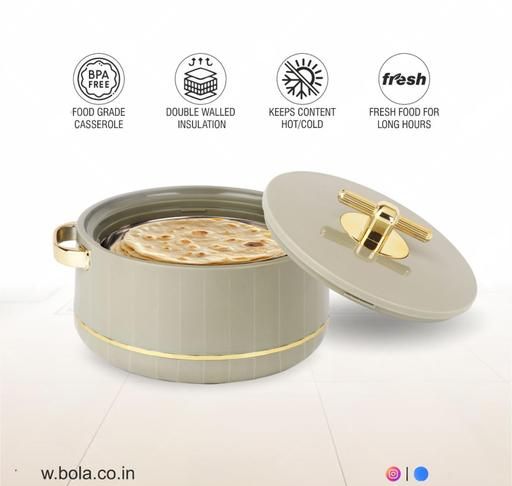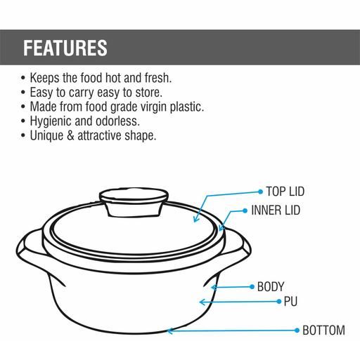 brings to you an aesthetically designed vibrant range of casseroles to end your worries of keeping your food warm during the dinner. Being an absolute marvel of design elegance, the double walled casseroles are made of best quality food grade material. It helps maintain the original temperature of the food, hot or cold, for long. The inner mirror finished liner parts are fabricated out of a non-magnetic stainless steel seat. The plastic outer body and lead components are molded out of virgin food grade plastic polymers which gives a sturdy and beautiful finish. With a unique glazed finish that gives a sophisticated look, is one of a superlative essential in your kitchen collections. Scientifically measured insulation properties keep food warm and fresh just as home packed food is expected to be.
