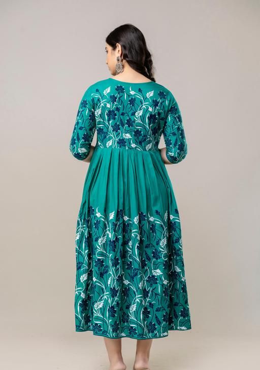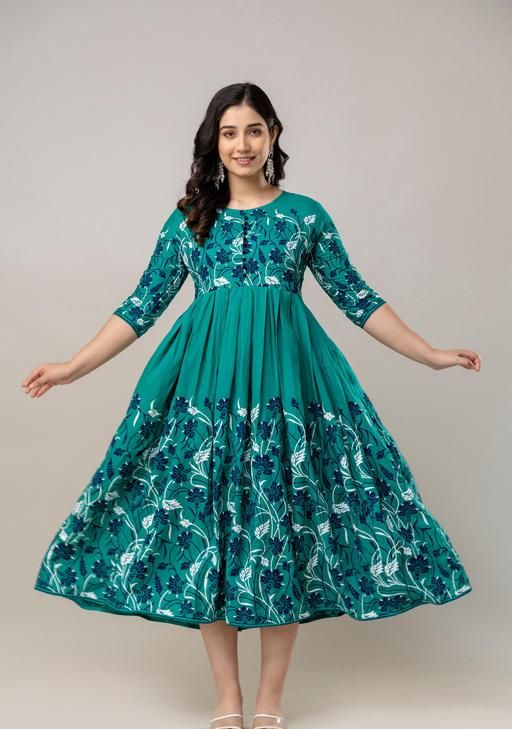 This stylish floral printed anarkali kurta is a stunning, sparkling, trendy, fashion-forward traditional outfit perfect for women who appreciate elegance and comfort. A stylish, modern design that falls just below the calf with a classic round neckline and 3/4 sleeves. Perfect for formal events, weddings, festivals, parties, or traditional gatherings. Abhisarika, Aishani Kurtis, superior Kurtis, Modern Kurtis, Printed Anarkali Kurtis, Flared long kurtas for women, floral anarkali kurtis, anarkali kurtis for women, office kurtas. Aarav kurtis, flossy anarkali.