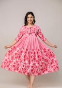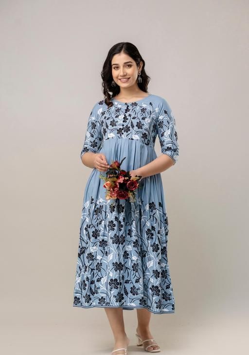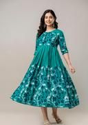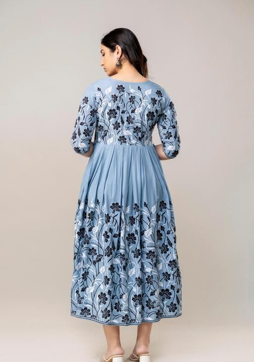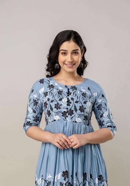 This stylish floral printed anarkali kurta is a stunning, sparkling, trendy, fashion-forward traditional outfit perfect for women who appreciate elegance and comfort. A stylish, modern design that falls just below the calf with a classic round neckline and 3/4 sleeves. Perfect for formal events, weddings, festivals, parties, or traditional gatherings. Abhisarika, Aishani Kurtis, superior Kurtis, Modern Kurtis, Printed Anarkali Kurtis, Flared long kurtas for women, floral anarkali kurtis, anarkali kurtis for women, office kurtas. Aarav kurtis, flossy anarkali.
