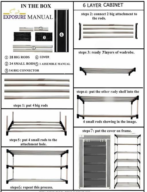 EXPOSURE 6 LAYER PVC COLLAPSIBLE SHOE RACK FRAME ARE MADE WITH METAL COLOUR COATED PIPE AND BIG CONNECTORS ALSO THEIR SHELF AND COVER ARE MADE WITH NON WOMEN FABRIC, THAT’S MAKE YOUR HOME WELL AND DÉCOR.