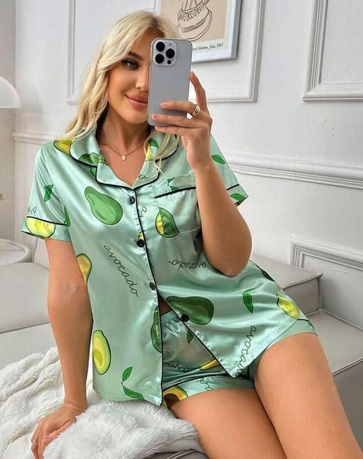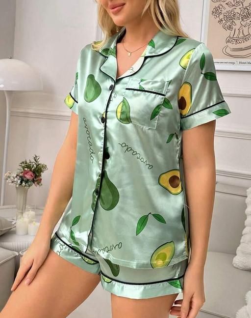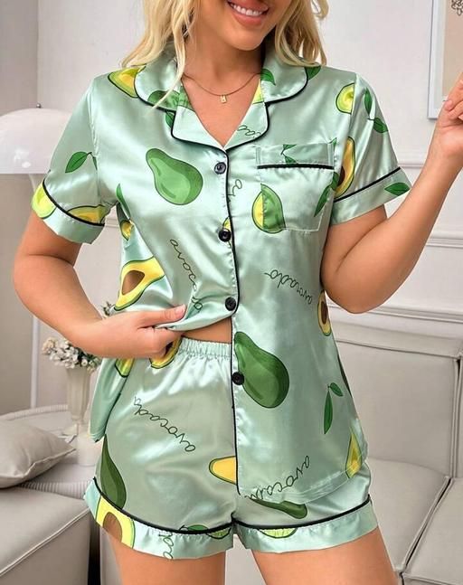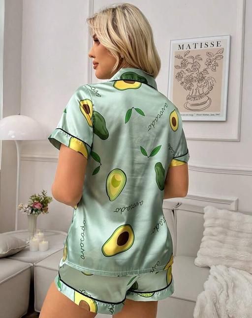 Indulge in comfort and playful style with this charming short pajama set. Crafted from a soft, silky satin fabric, this two-piece ensemble features a cheerful all-over print of ripe avocados and the word "avocado."