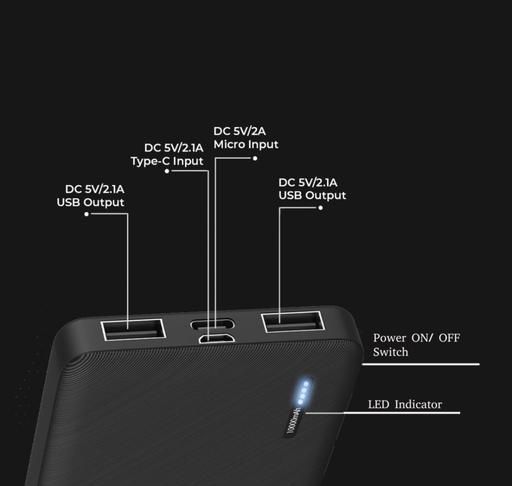 Choose the LA' FORTE (Flixx) UltraVolt 10000 mAh. Where power, elegance, and reliability converge.Powerful 10,000 mAh Lithium Polymer Battery to efficiently charge your devices multiple timesDual input ports: Can be charged using either Micro USB or Type C cableEnables fast charging with dual output of 5V and 2.4A with a maximum power of 12W.It ensures safety from overcharging, overheating and short-circuits with its four-layer circuit protection.The power bank can be charged easily with a type-C cableUltra-compact design with rubber body having smooth edges.