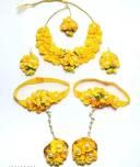 Spaceincart White Pearl Beaded Gota Patti Floral Beaded Haldi & Mehendi Necklace With Earrings, Maang Tikka & Bracelet Jewellery Set For Girls and Women Yellow