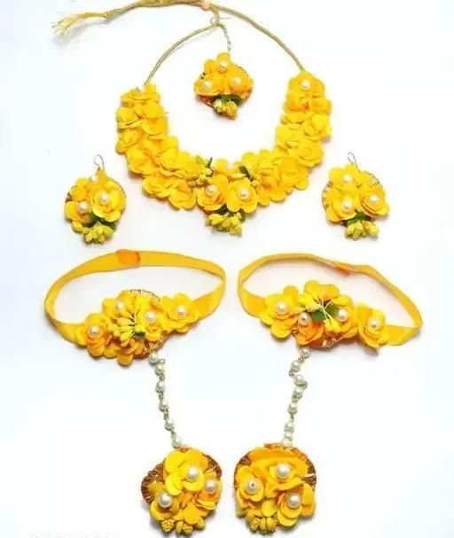 Name: Spaceincart White Pearl Beaded Gota Patti Floral Beaded Haldi & Mehendi Necklace With Earrings, Maang Tikka & Bracelet Jewellery Set For Girls and Women Yellow