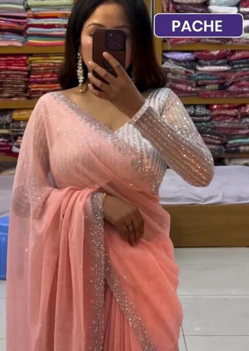 Name: C_B_D_PEACH Saree Fabric: Georgette Blouse: Running Blouse Blouse Fabric: Mulberry Silk Pattern: Embellished Blouse Pattern: Same as Border Net Quantity (N): Single Sizes: Free Size (Saree Length Size: 5.5 m, Blouse Length Size: 0.8 m) Country of Origin: India