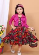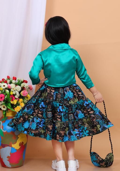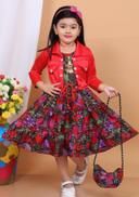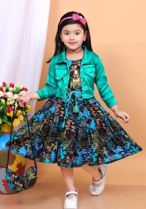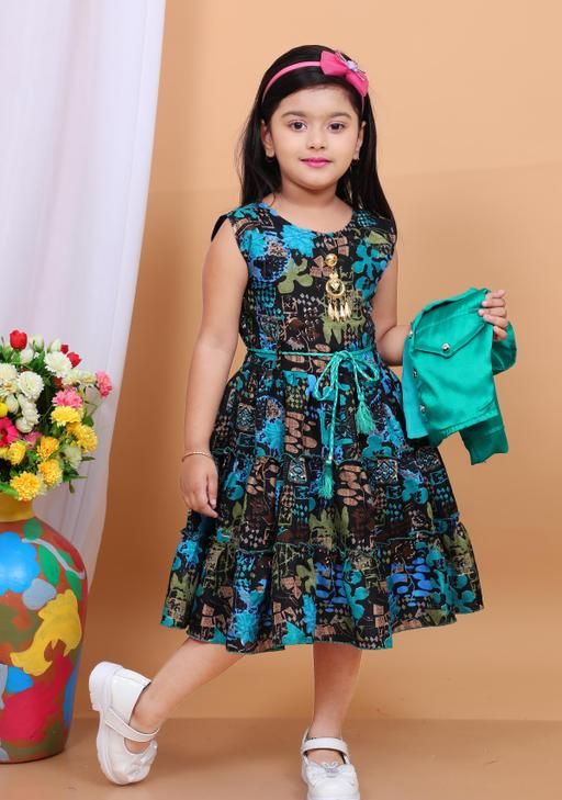 Name: Stylish Girls Floral Print Dress with Jacket & Matching Bag | A-line dress, A-line fit, above knee length, short sleeve sleeves, round neckline, embellished with beads, suitable for partywear, in teal and black abstract print, comes with headband