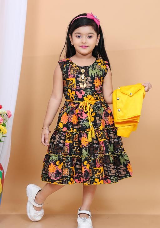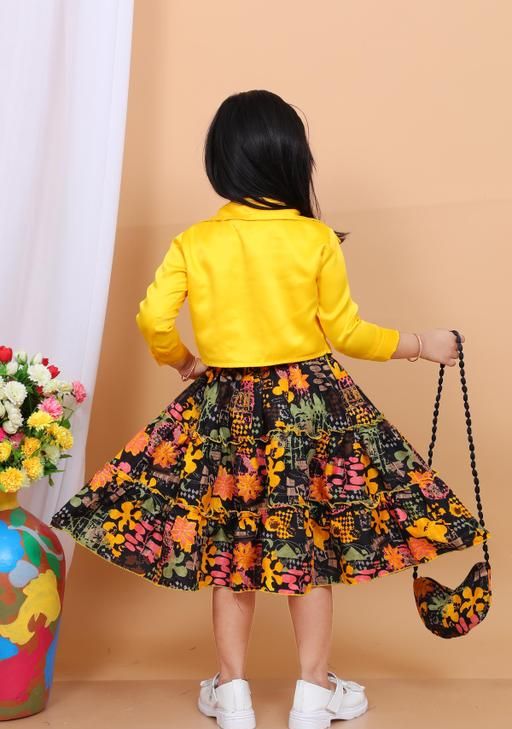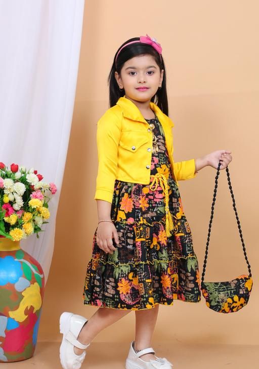Name: Stylish Girls Floral Print Dress with Jacket & Matching Bag | tiered dress, A-line fit, above knee length, long sleeve sleeves, round neckline, suitable for partywear, in multicolor floral print, yellow jacket, comes with handbag