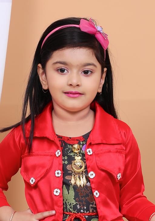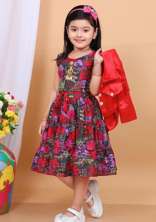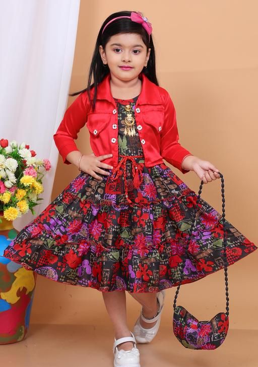 Name: Stylish Girls Floral Print Dress with Jacket & Matching Bag | party frock, A-line fit, above knee length, long sleeve sleeves, round neckline, embellished with beads, suitable for partywear, in red jacket, black and red floral print dress, comes with handbag, headband