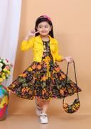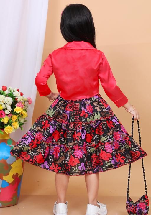 Stylish Girls Floral Print Dress with Jacket & Matching Bag | party frock, A-line fit, above knee length, long sleeve sleeves, round neckline, embellished with beads, suitable for partywear, in red jacket, black and red floral print dress, comes with handbag, headband