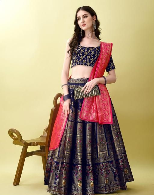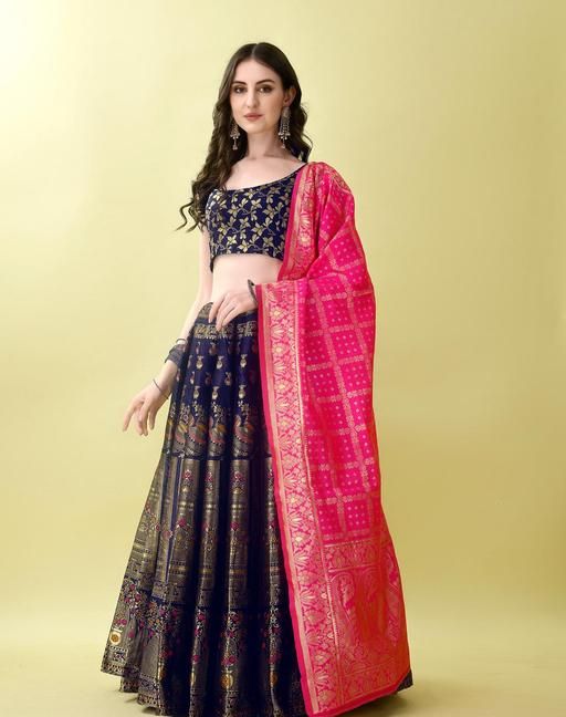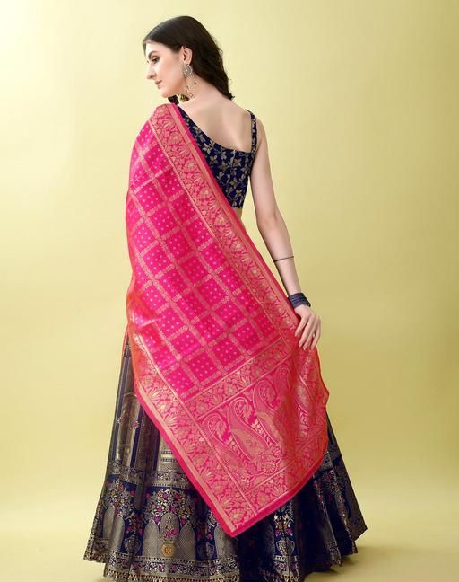 Name: Navy Blue and Pink Banarasi Silk Work Lehnega Choli with Dupatta For Marriage,Holi,Navaratri,Engagement Parties or Bridal Showers,Anniversaries, Birthday,Reception,Sangeet or Mehendi