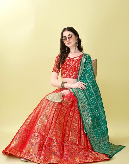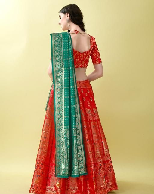 Name: Red and Green Banarasi Silk Work Lehnega Choli with Dupatta For Marriage,Holi,Navaratri,Engagement Parties or Bridal Showers,Anniversaries, Birthday,Reception,Sangeet or Mehendi