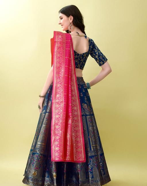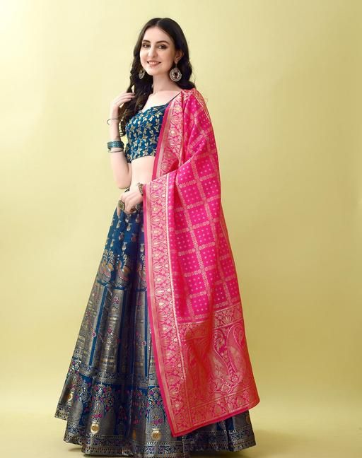 Name: Peacock Blue and Pink Banarasi Silk Work Lehnega Choli with Dupatta For Marriage,Holi,Navaratri,Engagement Parties or Bridal Showers,Anniversaries, Birthday,Reception,Sangeet or Mehendi