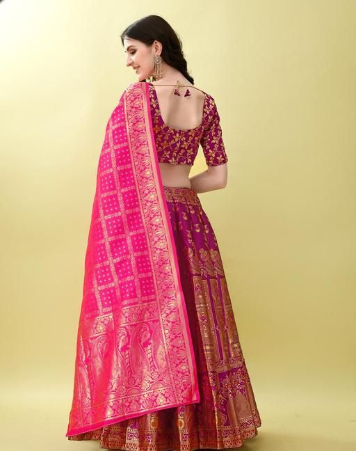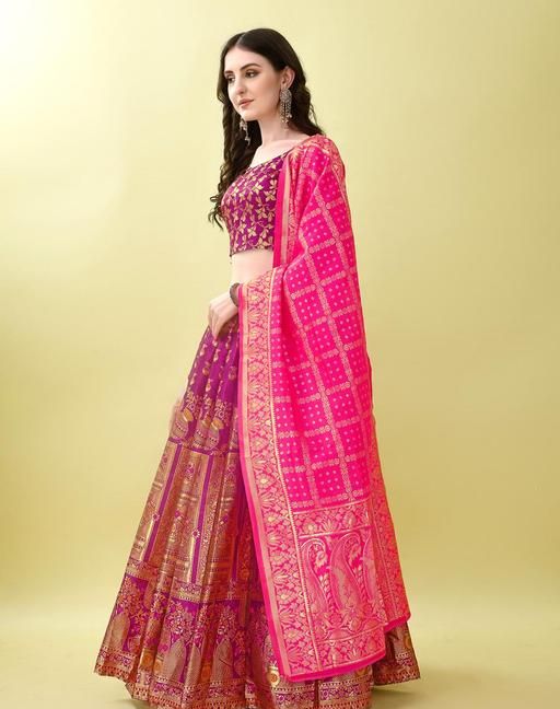 Name: Purple and Pink Banarasi Silk Work Lehnega Choli with Dupatta For Marriage,Holi,Navaratri,Engagement Parties or Bridal Showers,Anniversaries, Birthday,Reception,Sangeet or Mehendi